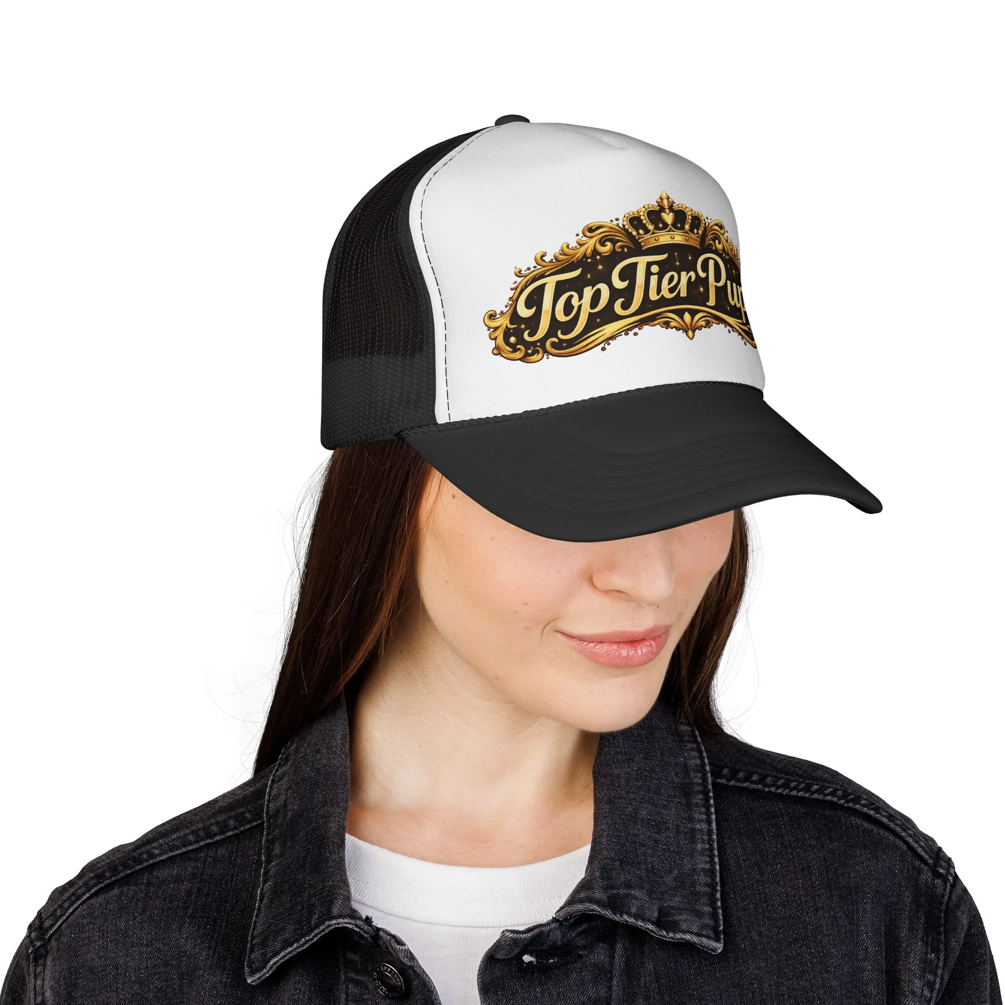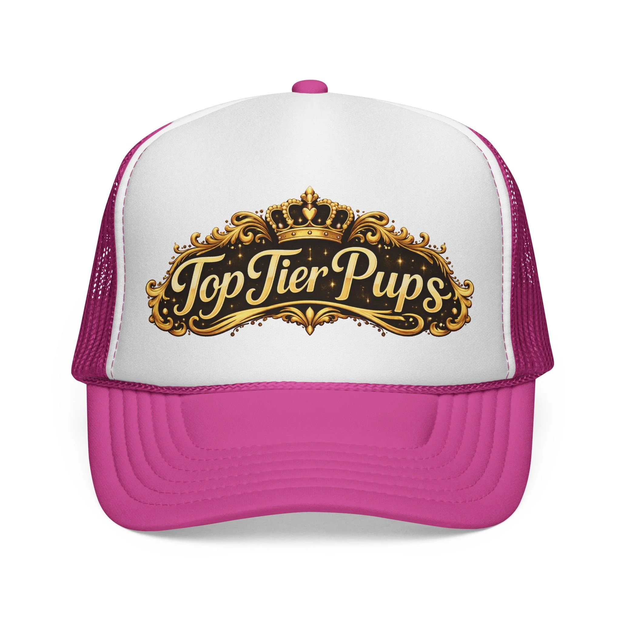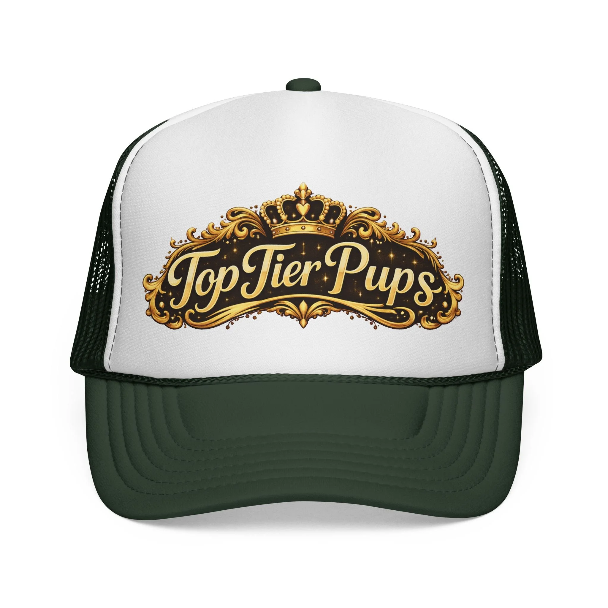 This trucker cap blends vintage flair with everyday wearability. The foam front showcases a richly detailed, gold-accented crest that reads “Top Tier Pups,” giving the design an upscale, playful energy. Lightweight mesh backs keep air flowing on warm days, while the adjustable snap lets you dial in a comfortable fit. Wear it to dog meetups, morning walks, or weekend errands — it adds a confident, slightly nostalgic accent to casual outfits and celebrates a love of pups without being loud. Creases will relax after unpacking and a few wears, and the bold print stays vivid through regular use.