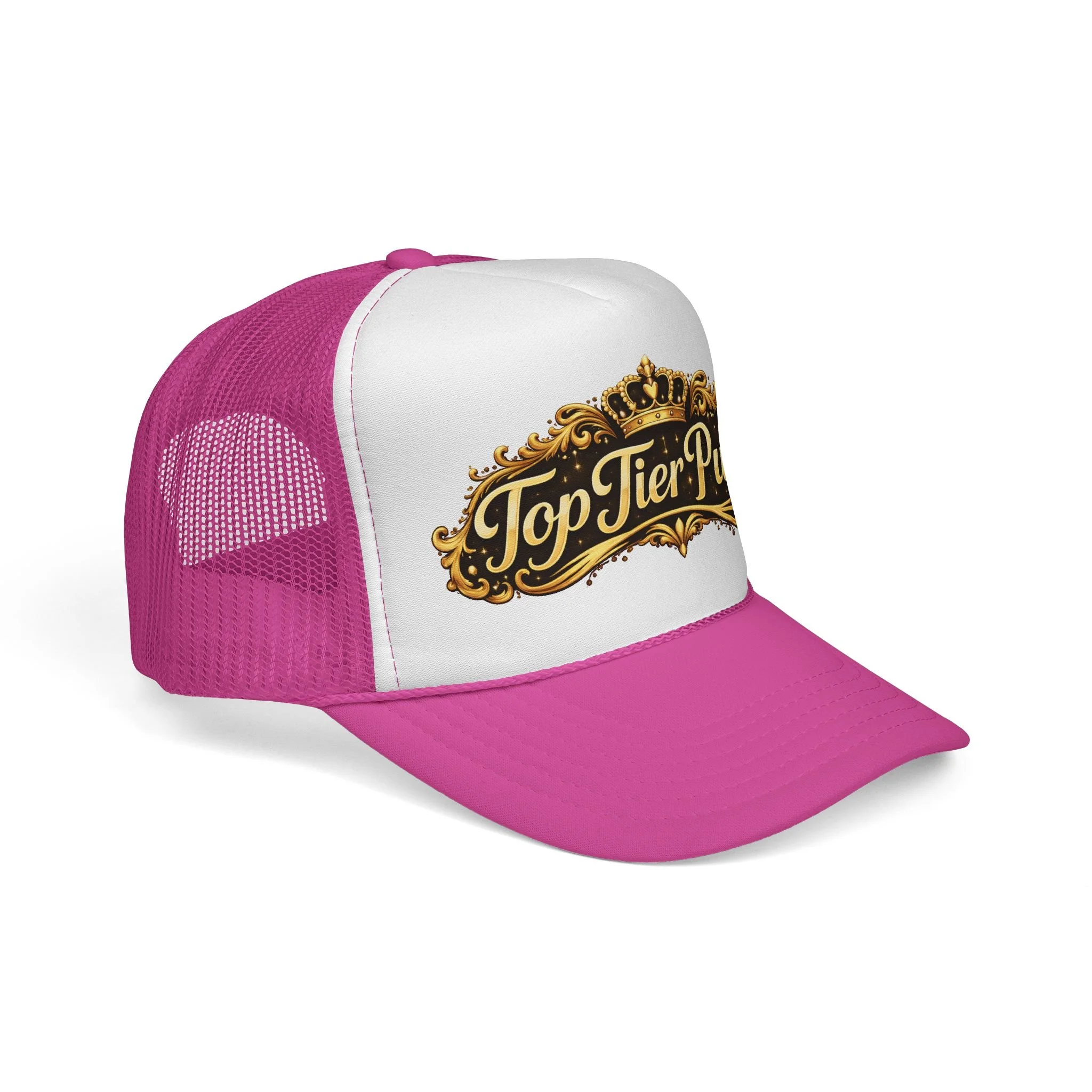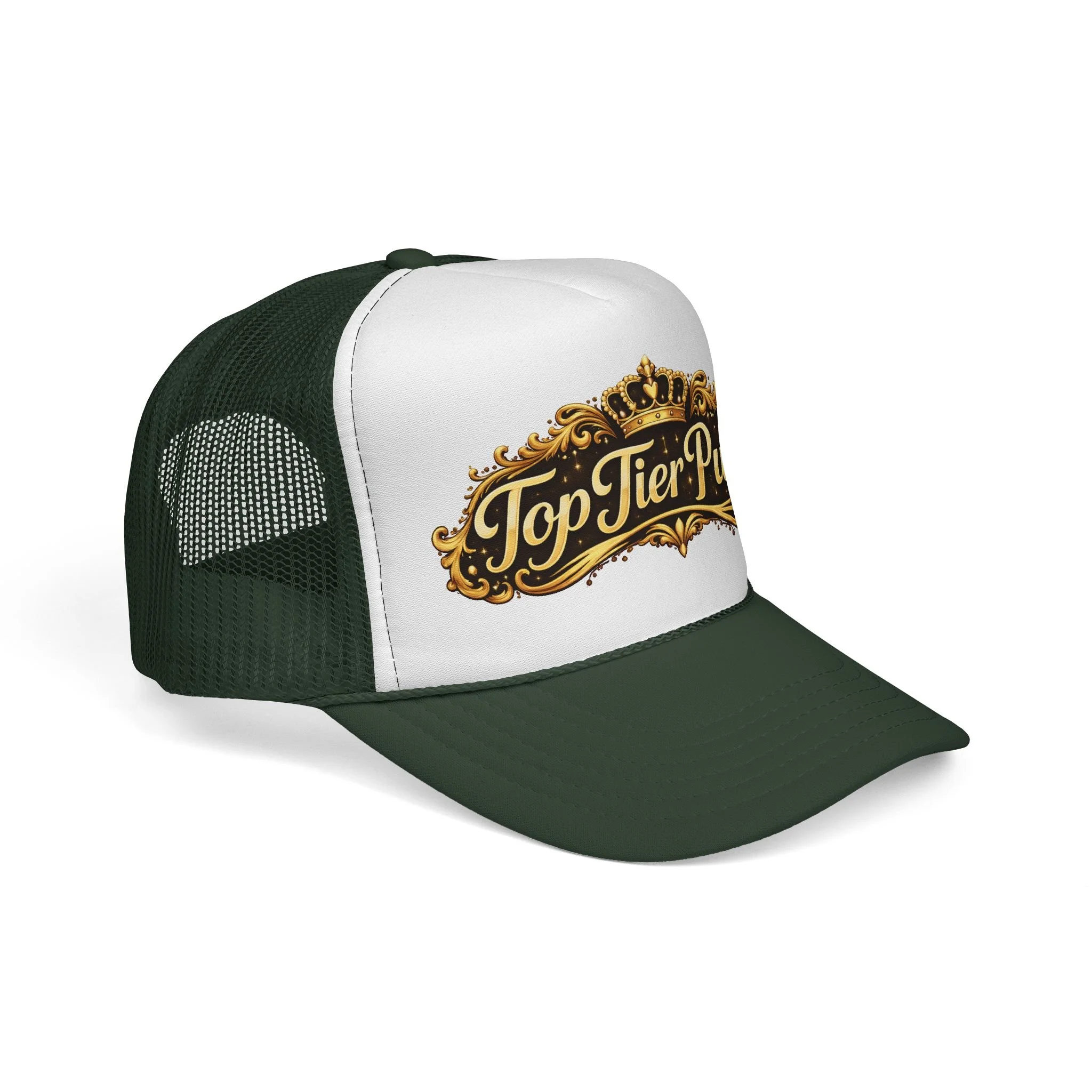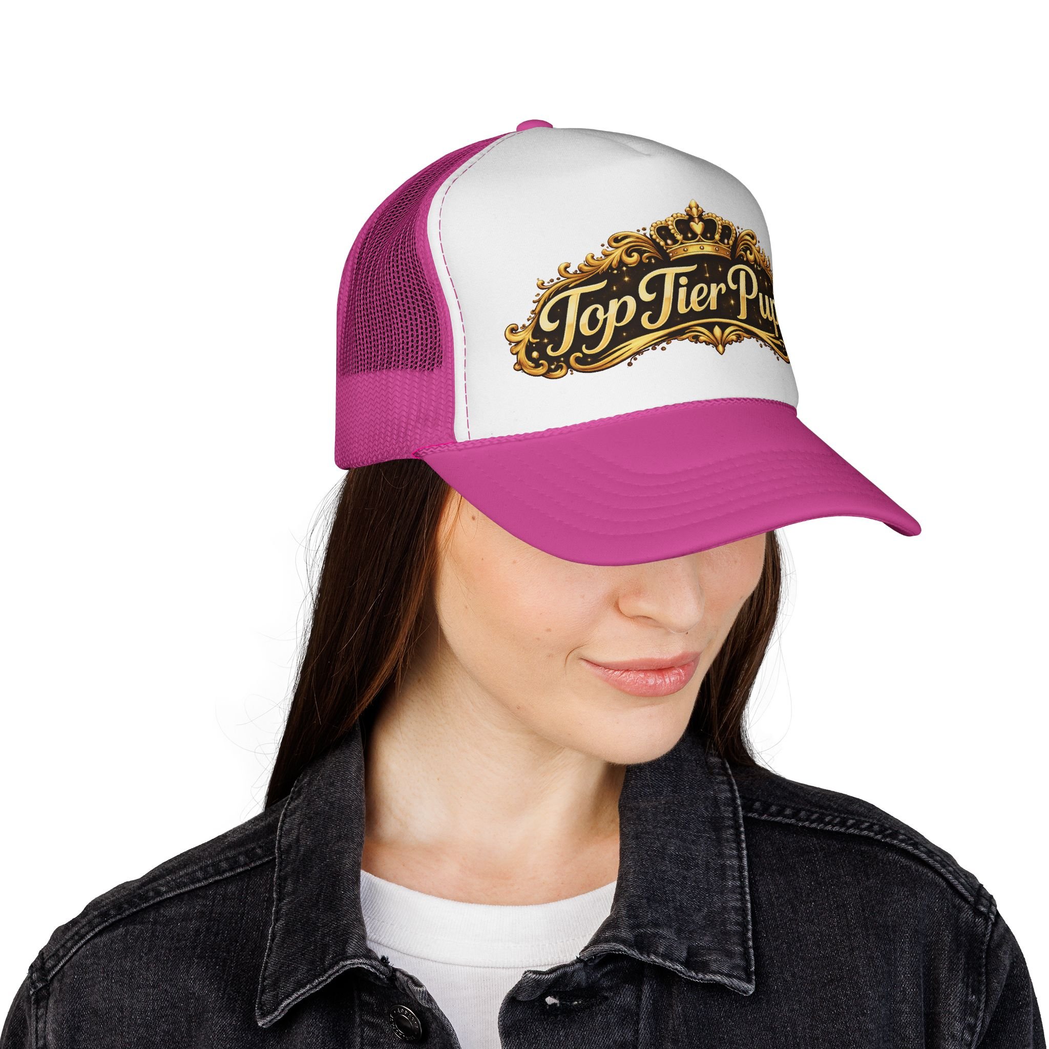 This trucker cap blends vintage flair with everyday wearability. The foam front showcases a richly detailed, gold-accented crest that reads “Top Tier Pups,” giving the design an upscale, playful energy. Lightweight mesh backs keep air flowing on warm days, while the adjustable snap lets you dial in a comfortable fit. Wear it to dog meetups, morning walks, or weekend errands — it adds a confident, slightly nostalgic accent to casual outfits and celebrates a love of pups without being loud. Creases will relax after unpacking and a few wears, and the bold print stays vivid through regular use.